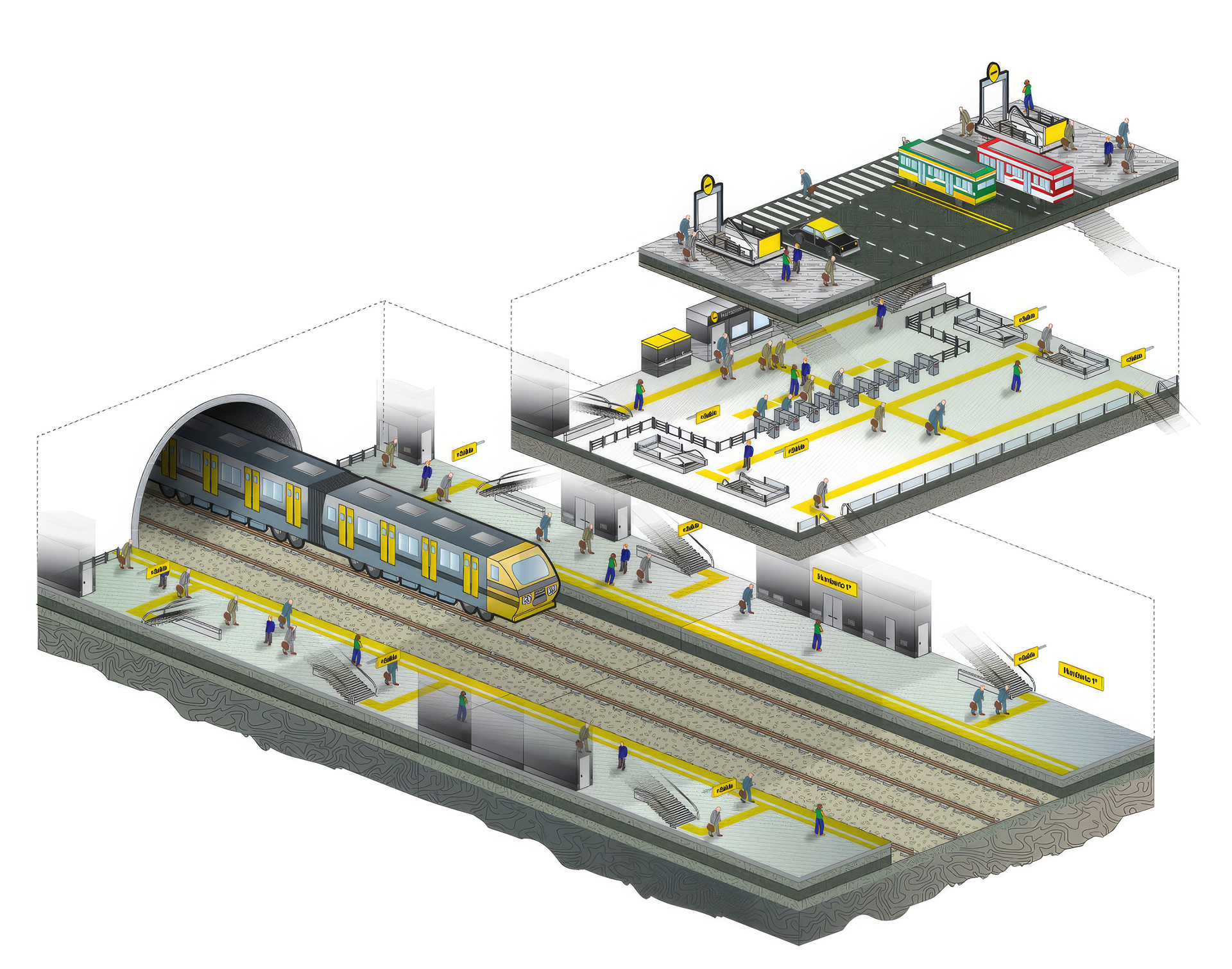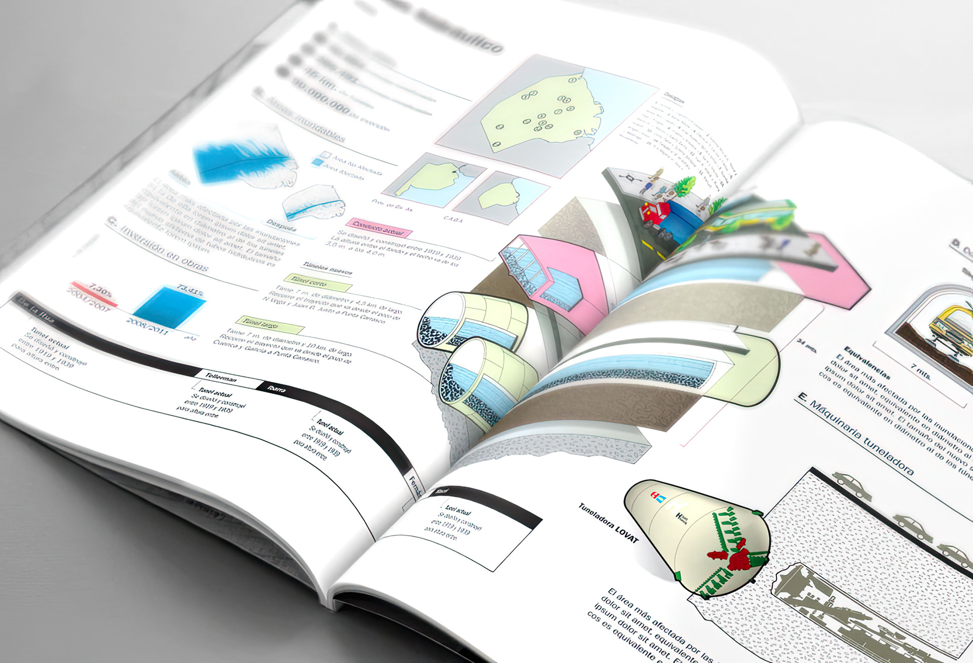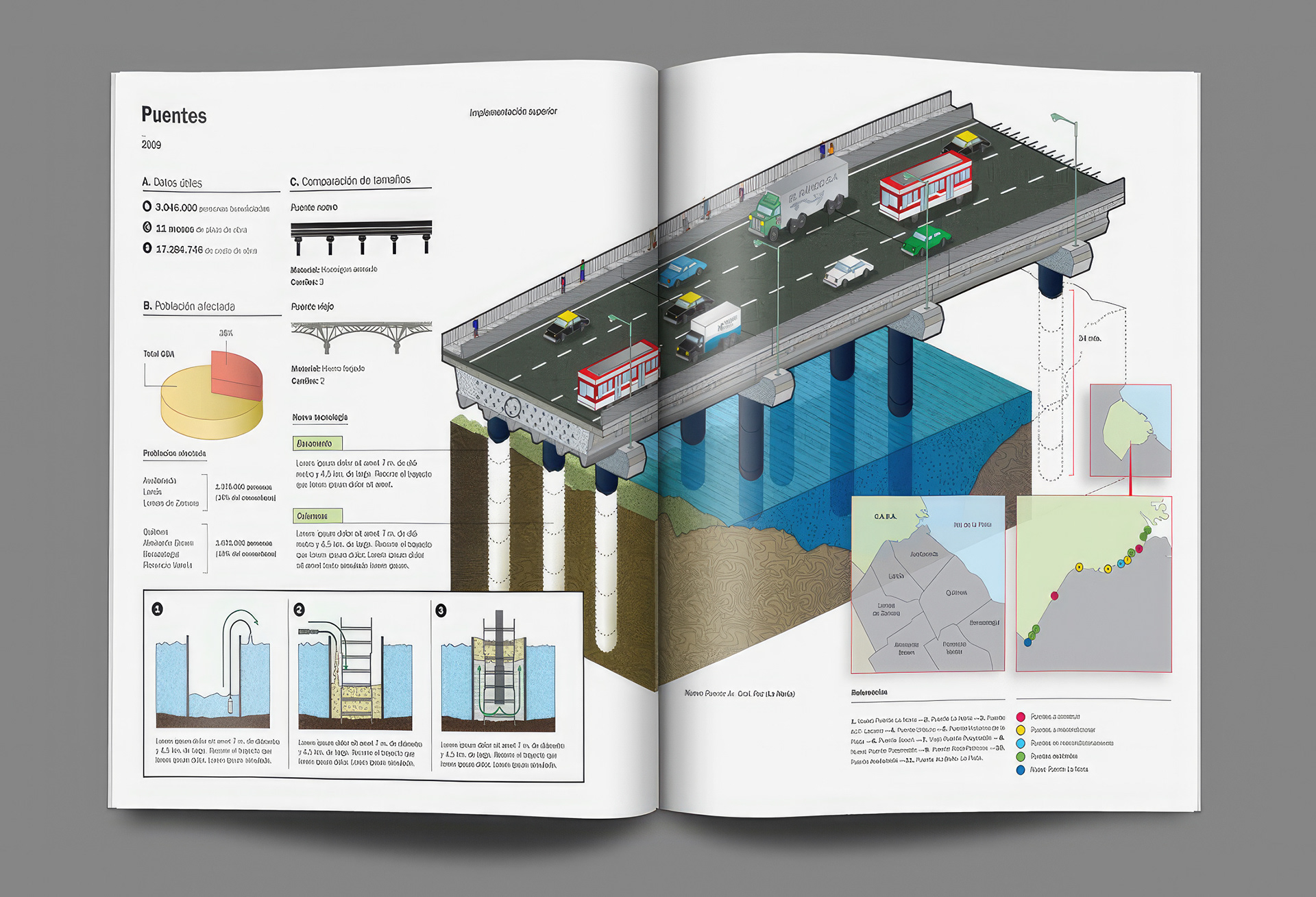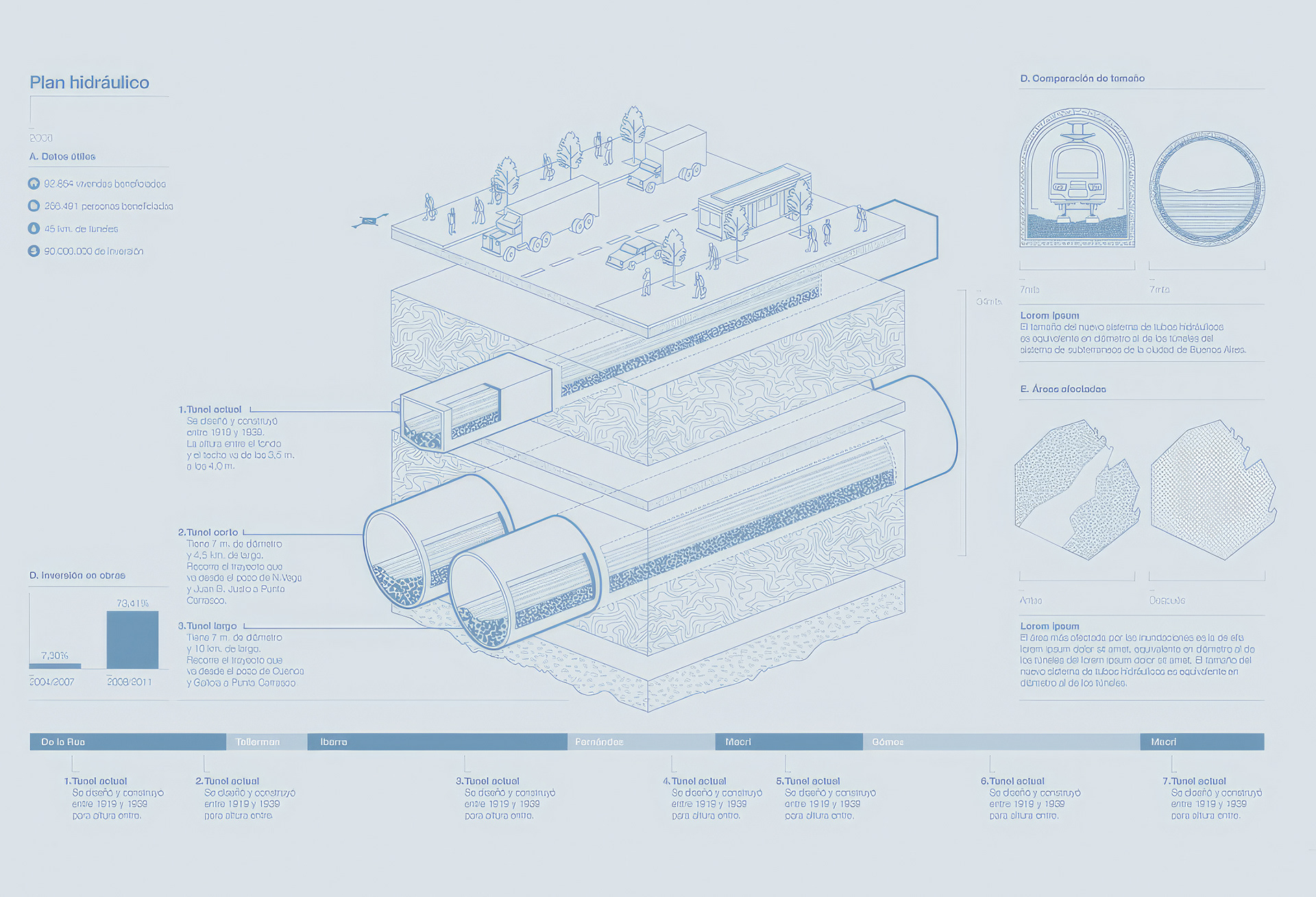 The Ministry of Urban Development (Ministerio de Desarrollo Urbano) designs and implements policies and programs for urban planning and the implementation and oversight of public works for the City of Buenos Aires. We were summoned to perform the information design for a series of key projects undertaken by the Ministry and translate them into a series of infographics. The challenge in this case was the need for accuracy in scale and in every detail, since the final result was destined for a strategic report on the projects carried out in the period between the year 2008 and 2012.