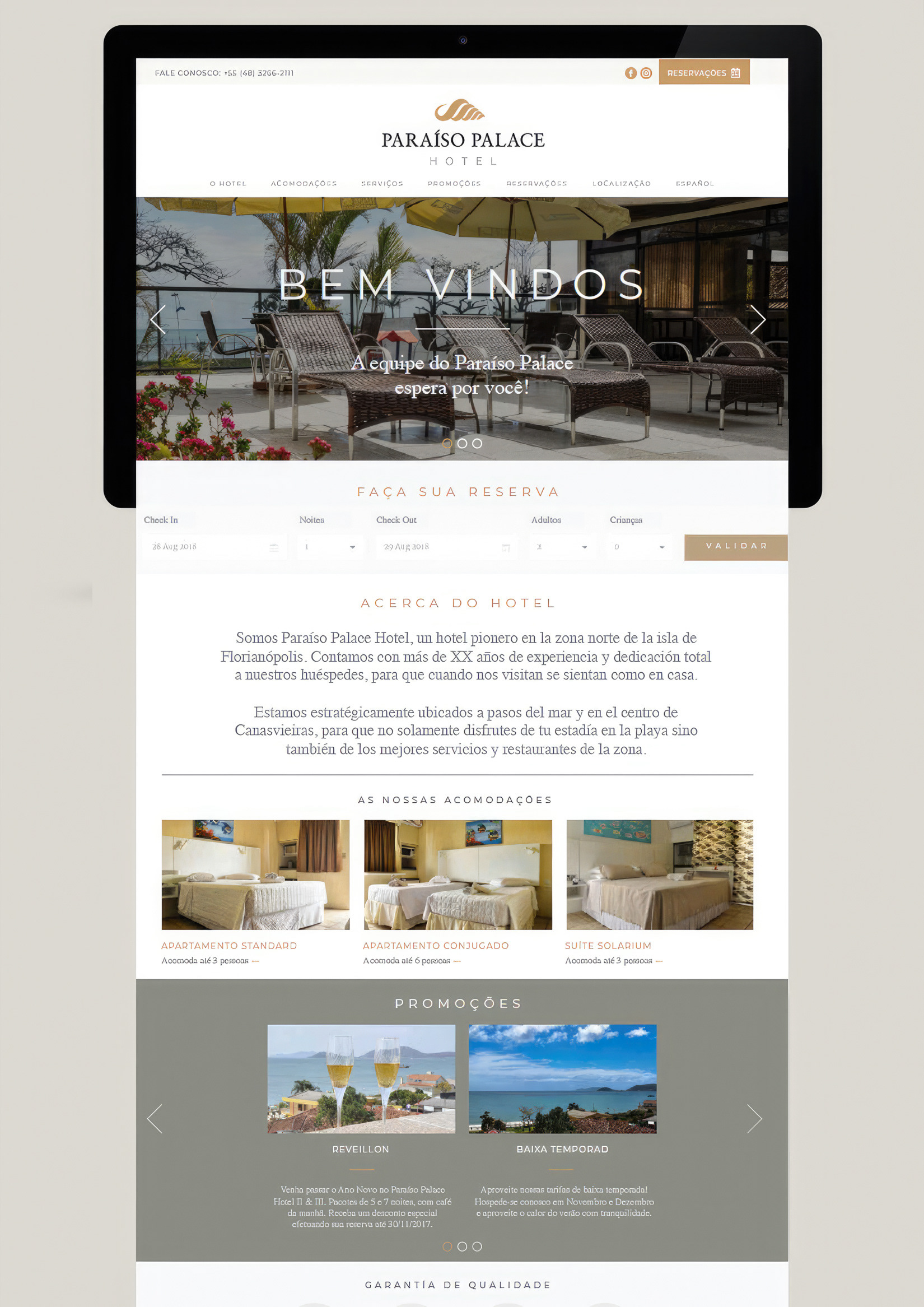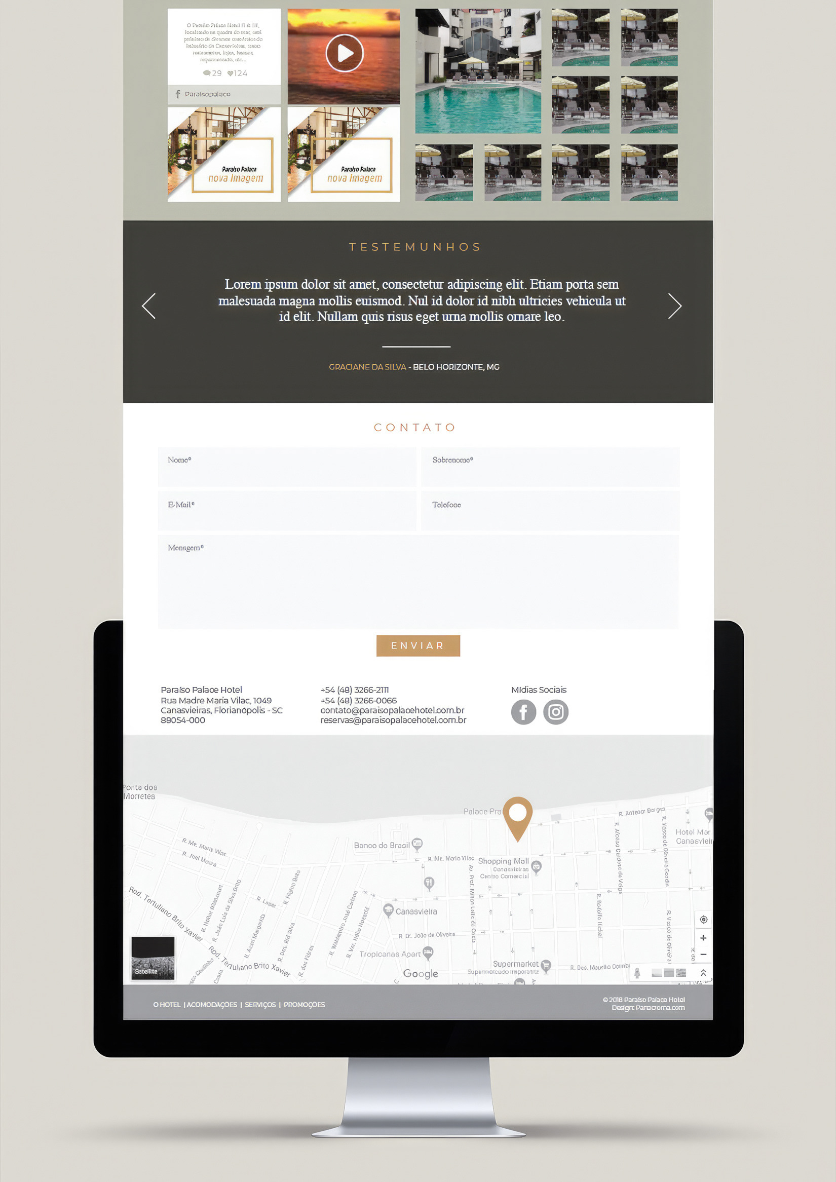 Paraíso Palace is a renowned hotel located in the northern region of Florianópolis-SC, Brazil — a true landmark of hospitality, known for its exceptional quality, refined service, and timeless style. It stands as a benchmark in the local tourism scene and a flagship venture for one of the most prestigious families in the state. Our challenge was to create a brand system that captured both the sophistication and contemporary spirit of the hotel. We developed a visual identity that feels elegant yet approachable, complemented by a modern website and cohesive social media presence, ensuring consistency and a premium experience across all communication touchpoints.